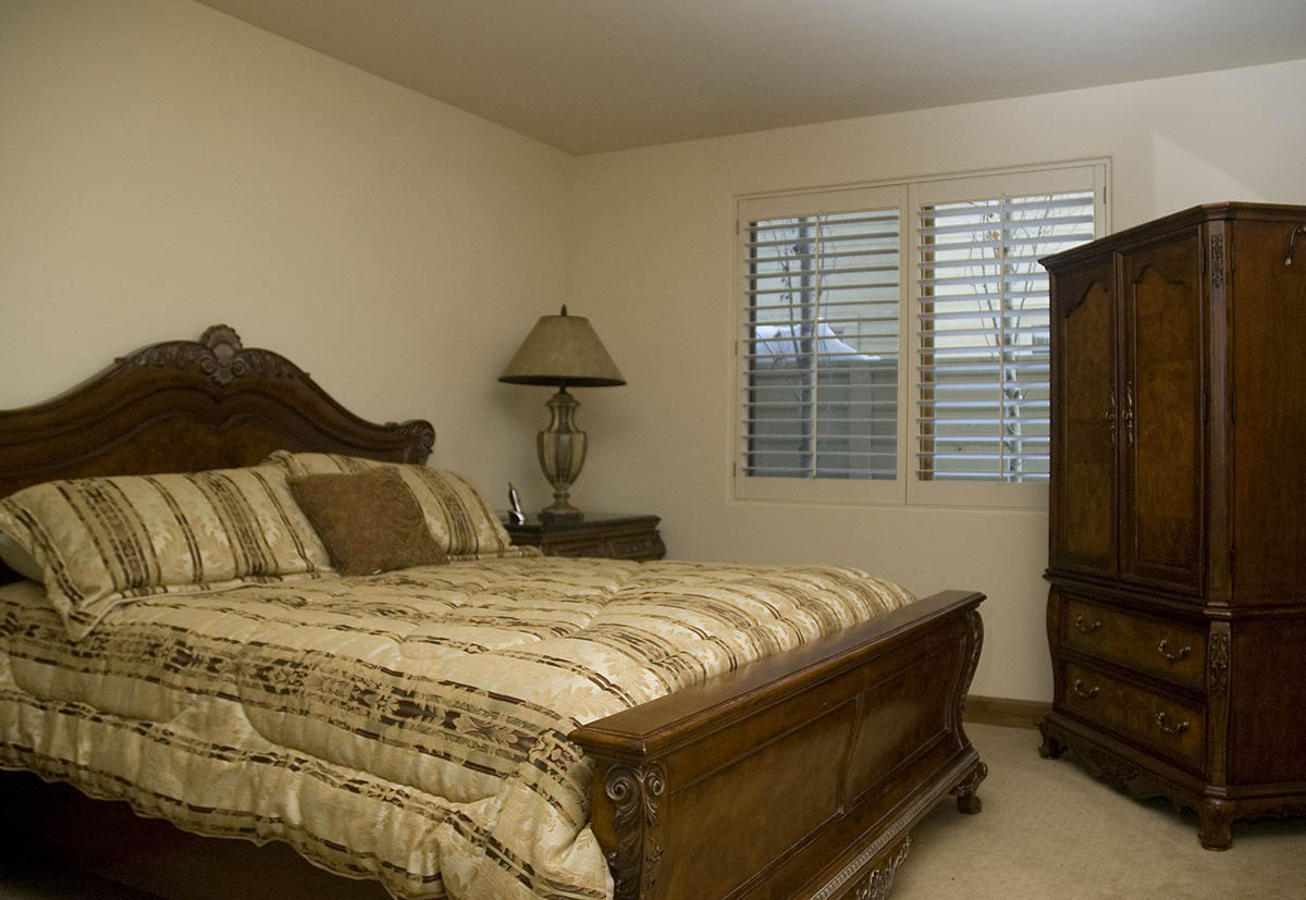 This luxury property easily accommodates four couples each with their own King Bedroom Suite with bathroom. This photograph is of one of the downstairs King Bedroom Suites with a bathroom vanity and walk-in stone tiled shower enclosure. A large television with premium cable and a DVD player is in the armoire.